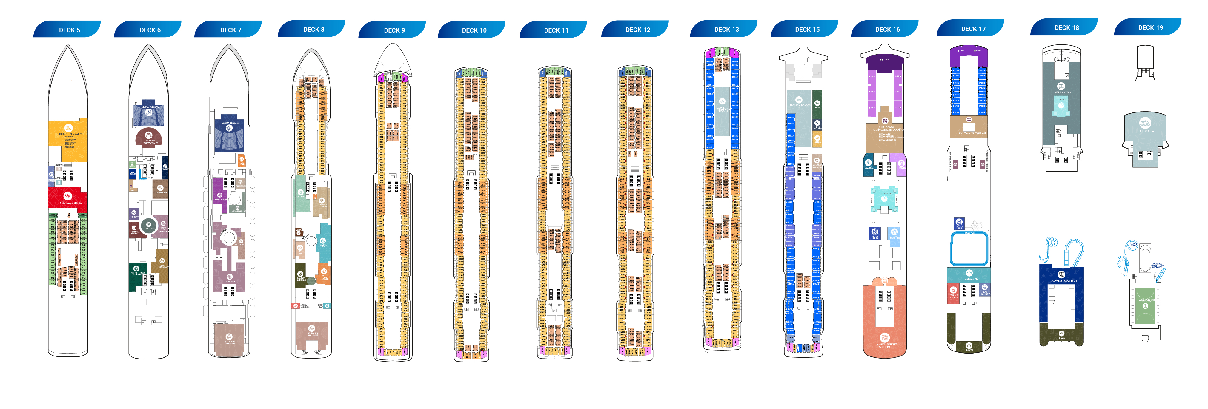 посещение общественных помещений лайнера (бассейны, джакузи, аквапарк и веревочный парк, стена для скалолазания, тренажерный зал, мини-гольф и пр.)